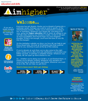 More ScreenshotsThe AimHigher site encouraged people to take up Higher Education, whatever stage in life they may be at. The website was so successful that the Welsh Assembly Government comissioned us to create a version localised for Wales, with both English and Welsh translations - which required careful proof-reading to ensure that special characters were successfully encoded.