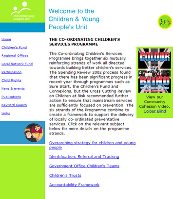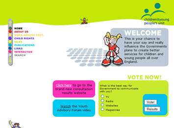 The original CYPU websites were created for corporate and youth audiences - an online presence for the Children and Young People's Unit, a cross-government unit focused on child poverty, youth disadvantage, and projects such as re-engaging younger voters. Later a seperate site was created to display the results of nationwide survey amongst children and young people to discover what they really wanted and expected from the Government.