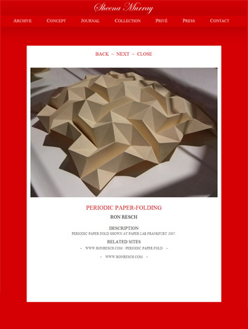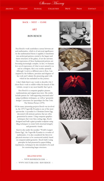 The website also includes art and museum sections showcasing the designers inspirations, such as tghe works of computer graphics pioneer, mathematician and origami innovator Ron Resch.