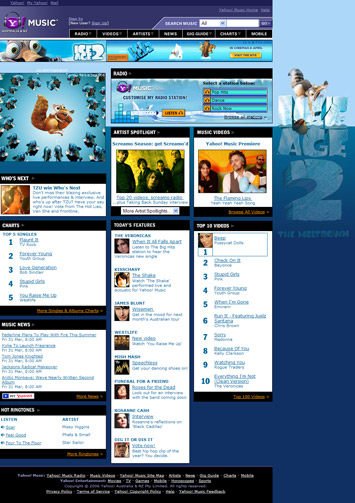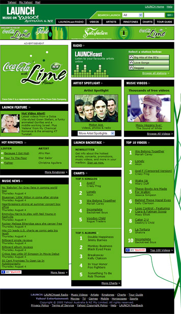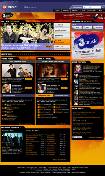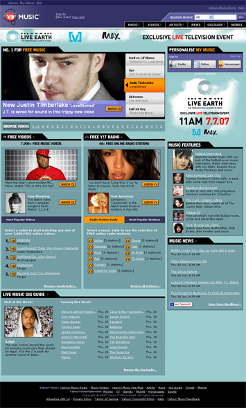 Aside from being a major advertising opportunity, the Yahoo!7 Music site was an innovative Internet Radio streaming service, personalised to the user in that every song that was served to them could be rated, affecting what songs would subsequently be served. Yahoo! Music was also a hub for music news, the latest chart details and information on gigs throughout Australia.