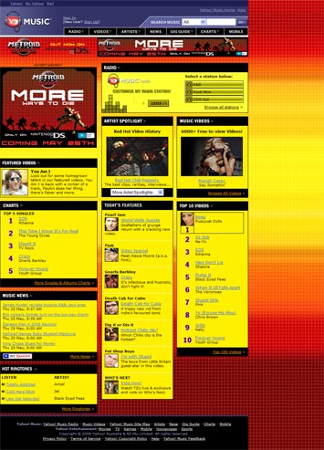 The Music website was redesigned twice during my time at Yahoo! Both versions of the site were coded to be able to accept a second Style Sheet to alter colours and graphical elements in order to co-brand with third-party advertising campaigns running in the websites advert slots. While at Yahoo! I coded and deployed almost 50 such branded advertising takeovers.